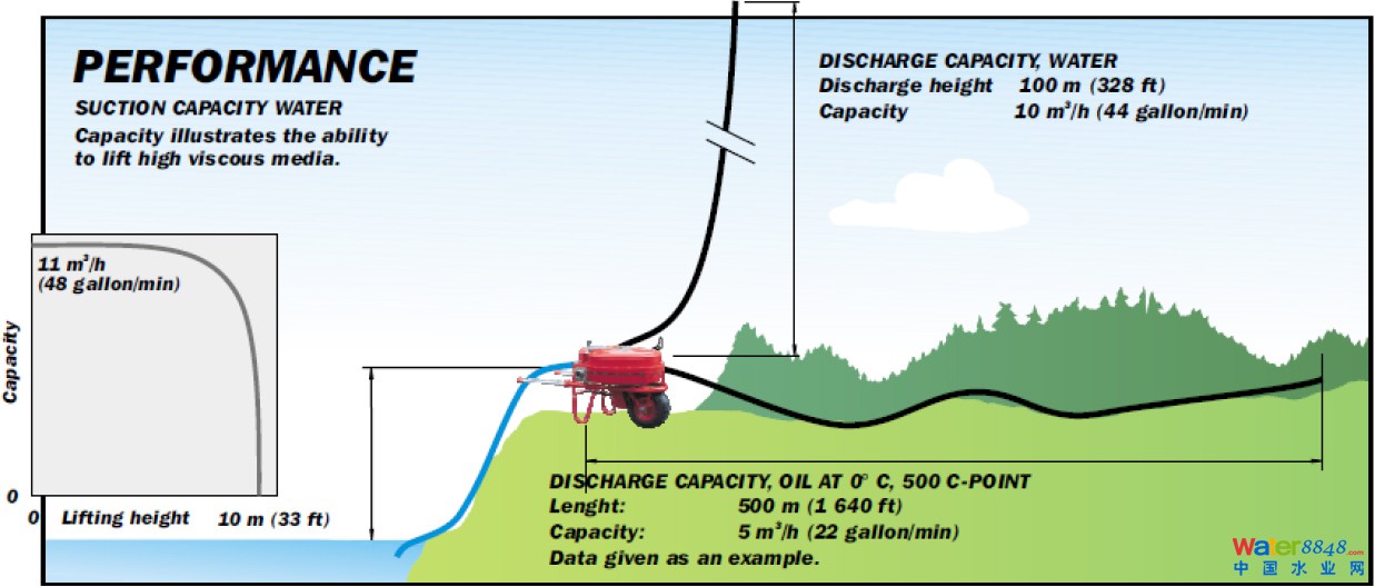 Salarollpump溢油收集系統(tǒng)對水的吸入高度可以達到10m,流量為11m³/h;揚升高度可達為100m,流量為10m³/h;對于0℃條件下,500 C點的油,流量5m³/h時,可水平輸500米。