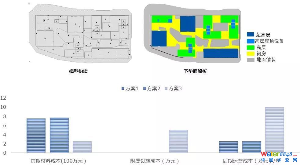 對現(xiàn)有建筑方案的受雨面進(jìn)行分析可知:裙房屋頂綠化比例21%、高層塔樓屋頂綠化比例49%、超高層屋頂不做綠化、首層地面鋪裝及綠化不做處理。