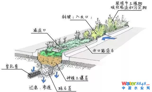 為充分利用高密度開發(fā)區(qū)的綠地空間,宜結(jié)合景觀,在地塊的匯水低點(diǎn)處設(shè)施復(fù)雜型雨水花園。雨水花園面積與匯水面面積之比一般為5%-10%。建議下沉高度為200-300mm,并應(yīng)設(shè)100mm的超高,且應(yīng)設(shè)置溢流設(shè)施。