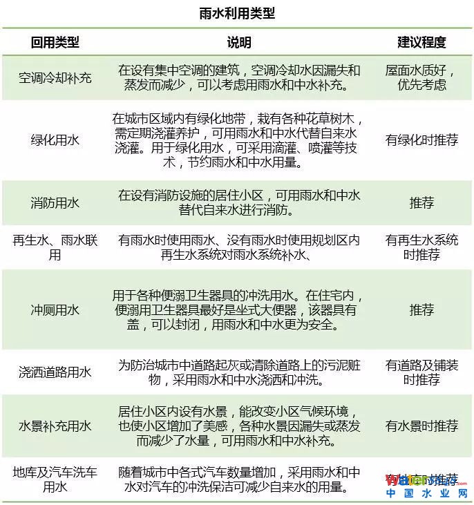根據(jù)高密度開發(fā)地塊對雨水回用的需求,合理確定雨水回用(調(diào)蓄)池的容積,雨水回用池宜收集屋頂、綠地等較為潔凈雨水,經(jīng)過沉淀、消毒等工藝后進(jìn)行回用。也可僅作為雨水調(diào)蓄削峰用途,在進(jìn)行雨水收集及初期雨水棄流后,錯(cuò)峰排出。高密度開發(fā)地塊水量需求大且雨水處理成本低(約0.1-0.2元/m3),宜優(yōu)先考慮空調(diào)冷卻補(bǔ)充及地庫及汽車洗車用水,可參考下表選用。