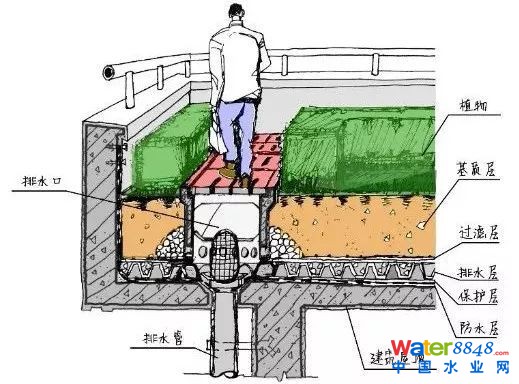 高密度開發(fā)區(qū)往往設(shè)計(jì)有裙樓及聯(lián)通塔樓之間的連廊,此處宜采用綠色屋頂形式來減少屋面徑流總量和徑流污染負(fù)荷,綠色屋頂又分為簡單式和花園式,基質(zhì)深度根據(jù)植物需求及屋頂荷載確定,簡單式綠色屋頂?shù)幕|(zhì)深度一般不大于150mm,花園式綠色屋頂在種植喬木時(shí)基質(zhì)深度可超過600mm,綠色屋頂?shù)脑O(shè)計(jì)可參考《種植屋面工程技術(shù)規(guī)程》(JGJ155)。