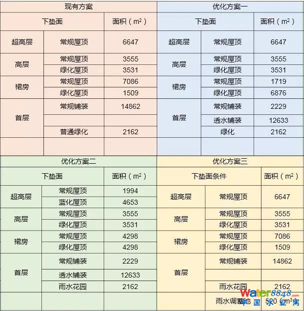 注:①優(yōu)化方案一以及優(yōu)化方案二海綿材料成本中,該成本為海綿設(shè)施總投資成本,未扣除原本就需要硬化鋪裝的費(fèi)用;其中,透水鋪裝所占投資額較大,為480萬元。