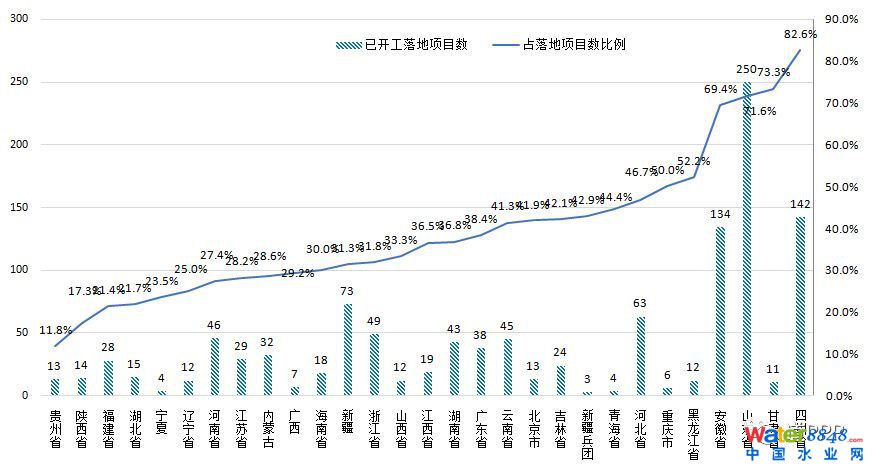 截至12月末,已開工項目1,159個,占落地項目總數(shù)的42.5%,季度環(huán)比凈增245個。各地情況如圖2-6。其中,山東(含青島)已開工250個,占該省落地項目的71.6%,季度環(huán)比凈增22個;四川已開工142個,占該省落地項目的82.6%,季度環(huán)比凈增58個;安徽已開工134個,占該省落地項目的69.4%,季度環(huán)比凈增71個;其余省份開工項目數(shù)量均少于100個。