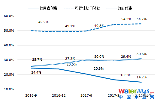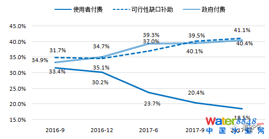 2016年9月末至2017年12月末管理庫PPP項目三種回報機制項目數(shù)占比情況如圖2-5-3,投資額占比如圖2-5-4?梢,使用者付費類項目的比重呈逐季度小幅下降趨勢,可行性缺口補助類和政府付費類項目的比重變化趨勢則相反。