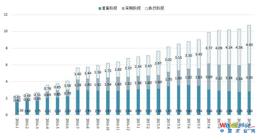 2016年1月至2017年12月末,管理庫項目數(shù)及各階段項目數(shù)如圖2-1-1、投資額如圖2-1-2,呈逐月增長趨勢,月均增長項目245個、投資額3,643億元。