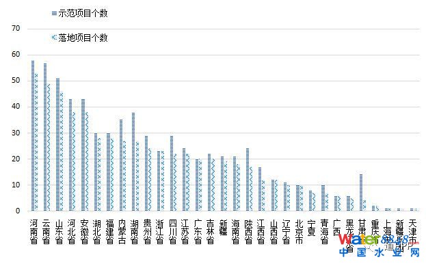 按各地落地示范項目數(shù)統(tǒng)計,河南已有53個示范項目簽約進入執(zhí)行階段,居全國第一;其他依次為云南49個、山東(含青島)46個、安徽38個、河北38個、湖北28個、福建(含廈門)28個、內(nèi)蒙古27個、湖南27個,其余各省均不足25個。上述9省份合計占落地示范項目總數(shù)的55.9%。各地示范項目數(shù)與落地數(shù)對比如圖1-4。