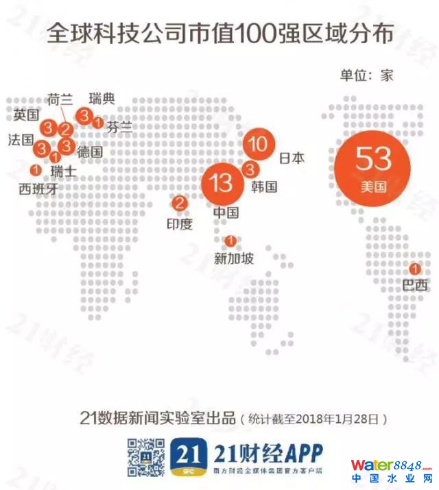 據(jù)21數(shù)據(jù)新聞實(shí)驗(yàn)室統(tǒng)計(jì),這100家科技巨頭主要集中在北美洲(53家)、亞洲(29家)、歐洲(17家)三大洲。另有1家在南美洲的巴西。