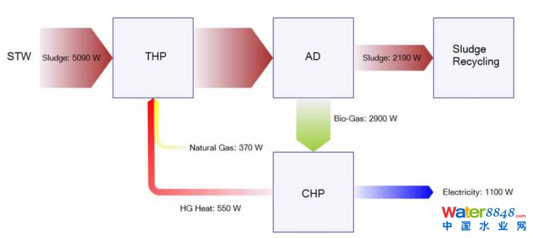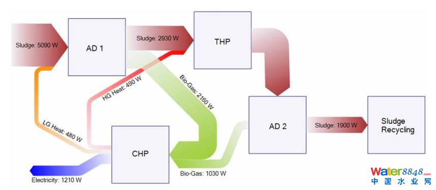 因為污泥經過初級消化后體量減小,所以該工藝占地只有常規(guī)工藝的2/3,并且由于是兩級厭氧消化,因而沼氣產量更大,沼氣總產量可達500m3/TDS,可揮發(fā)性固體去除率可達65%,電能產率為1200kWh/TDS。產能增加意味著通過熱電聯(lián)產工藝產生的熱能將有可能滿足熱水解工藝本身的熱量需求。圖9為ITHP工藝路線圖,圖10為能量流;鶊D。