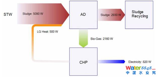 該工藝的產氣量大約為421m3/TDS,可揮發(fā)性固體去除率約為54%。污泥經帶式脫水之后的含固率可達28%。能量流;鶊D見圖8。