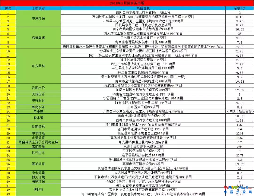 2018開年之際,1月份水務(wù)市場(chǎng)迎來了開門紅。據(jù)中國(guó)水網(wǎng)不完全統(tǒng)計(jì),本月21家環(huán)保上市企業(yè)共入手42大水務(wù)項(xiàng)目,累計(jì)金額達(dá)350.48億,勢(shì)如猛虎。