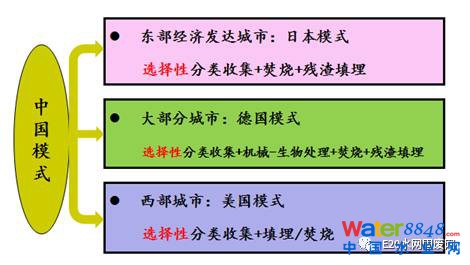 綜上,我認為,中國的生活垃圾處理模式大致可分為如下幾種情況:發(fā)達的地方,使用日本模式,就是選擇性分類收集+焚燒+填埋;大部分的城市可以選擇德國模式,選擇性分類收集+機械-生物的處理+焚燒+殘渣填埋;西部城市可用美國模式,選擇性分類收集+填埋/焚燒。為什么叫選擇性分類收集呢?這就包含了我國自己的特色,把有害的、有用的部分適當?shù)胤殖鋈ィ皇钦f都要分出來,而是前端適度地分類。比如講廚余垃圾分出10%,對于處理系統(tǒng)效率的提升可能就有足夠的效果了,若要求分出50%沒可能只是虛高的指標,分出來的還是混合垃圾。