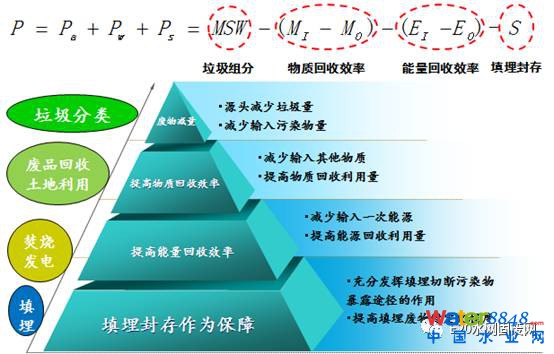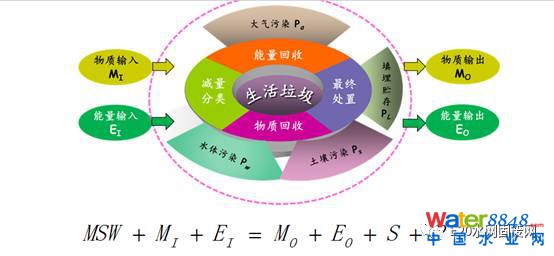 中國模式的確定,可以通過一些科學原理和技術(shù)原理來做一些判斷。垃圾處理是一個物質(zhì)能量的轉(zhuǎn)化過程,有輸入、有輸出,其中有一系列的反應(yīng)過程。在此過程中,垃圾量,物質(zhì)回收效率,能量回收效率,填埋封存量和污染物排放量之間的平衡關(guān)系可以用簡化的公式來表達,如下圖所示。