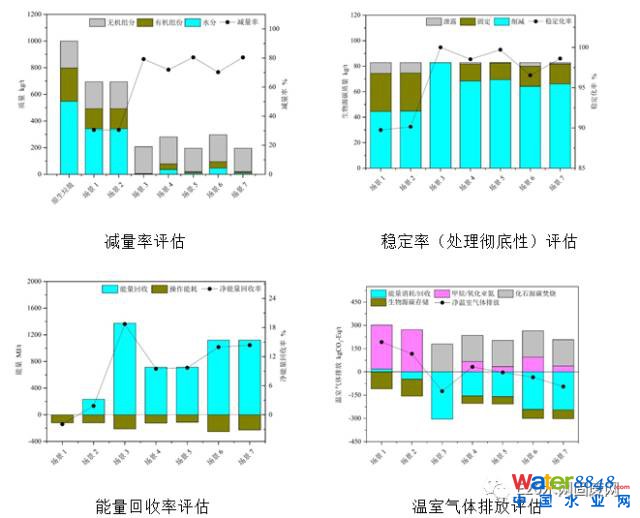 針對這七種情形,采用5個評估指標:減量化率;穩(wěn)定化率(處理徹底性);物質(zhì)回收;能量回收;溫室氣體減排。評估結(jié)果表明: