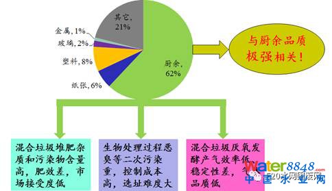 大家給予厚望的生物處理技術(shù)同樣面臨挑戰(zhàn)。源頭分類很難,分類效果差,依賴二次集中分選,增加了處理成本,影響系統(tǒng)穩(wěn)定運行及產(chǎn)品品質(zhì);臭味控制難,進料、分選、堆肥等環(huán)節(jié)惡臭釋放量大成分復雜,控制成本高占地面積大;土地利用難,堆肥及沼渣沼液土地利用存在諸多限制,市場接受度低,許多情況下仍然需要當做廢物處理;持續(xù)盈利難,產(chǎn)品非標準化產(chǎn)品,品質(zhì)相對較低,附加值較低,盈利模式不清晰。這些問題產(chǎn)生的根源與大量的廚余垃圾有著極強的關(guān)系。
