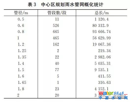 傳統(tǒng)開(kāi)發(fā)和海綿開(kāi)發(fā)兩種模式下,雨水管網(wǎng)系統(tǒng)的布置沒(méi)有變化,海綿模式只是通過(guò)改變地面下墊面特征,使傳統(tǒng)開(kāi)發(fā)模式下的雨水管網(wǎng)更高效、更完善。根據(jù)“控規(guī)”,中心區(qū)地下雨水管網(wǎng)包括現(xiàn)狀管網(wǎng)和規(guī)劃管網(wǎng),管網(wǎng)總長(zhǎng)約277.03 km,其中現(xiàn)狀雨水管總長(zhǎng)約80.77 km,規(guī)劃雨水管總長(zhǎng)約196.26 km。經(jīng)統(tǒng)計(jì),管徑在600~1 000 mm的管段長(zhǎng)度占總長(zhǎng)度的83%,統(tǒng)計(jì)情況見(jiàn)表3,概化后的雨水管網(wǎng)平面布置見(jiàn)圖7。