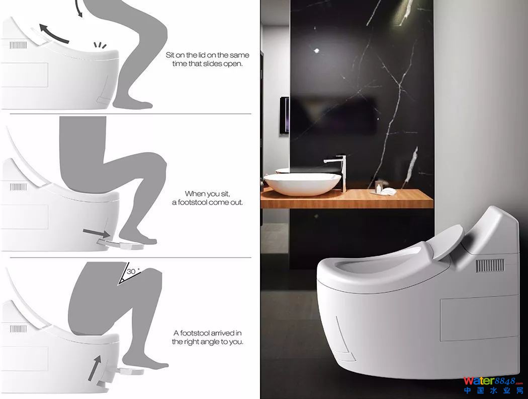 設計師Kim Hyeonseok打造的這款智能馬桶,利用人體工學原理,設計了腳蹬和傾斜的坐墊,再也不用擔心蹲太久腳發(fā)麻了。