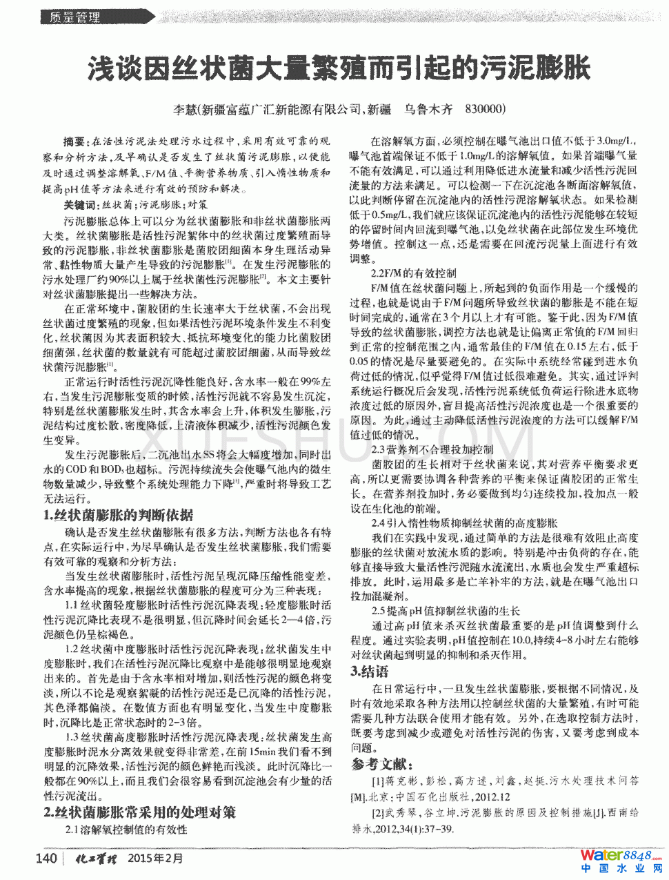 在活性污泥法處理污水過程中,采用有效可靠的觀察和分析方法,及早確認(rèn)是否發(fā)生了絲狀菌污泥膨脹,以便能及時通過調(diào)整溶解氧、F/M值、平衡營養(yǎng)物質(zhì)、引入惰性物質(zhì)和提高pH值等方法來進(jìn)行有效的預(yù)防和解決。