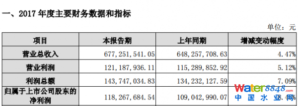 導讀: 2018年2月23日,中電環(huán)保公布2017年業(yè)績報告,在過去一年已實現(xiàn)營業(yè)收入67,725.15萬元,較去年同期增長4.47%;實現(xiàn)利潤總額14,374.7萬元,較去年同期增長7.09%;實現(xiàn)歸屬于上市公司股東的凈利潤11,826.77萬元,較去年同期增長8.46%。