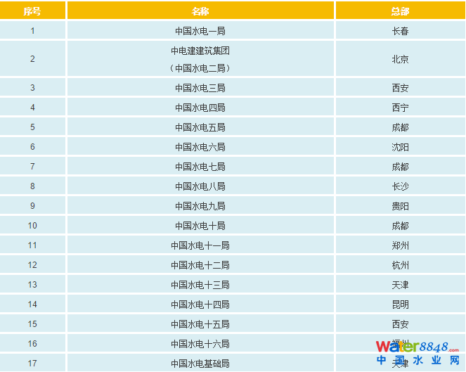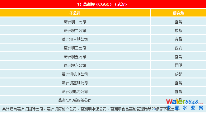 1)中國(guó)水電(SINOHYDRO),中國(guó)水利水電建設(shè)集團(tuán)公司,前身為燃料工業(yè)部水力發(fā)電建設(shè)總局,后幾經(jīng)合并與拆分, 2002年12月改組為中國(guó)水利水電建設(shè)集團(tuán)公司,2009年11月整體改制并控股創(chuàng)立中國(guó)水利水電建設(shè)股份有限公司,2011年成為中國(guó)電建全資子公司。總部北京。