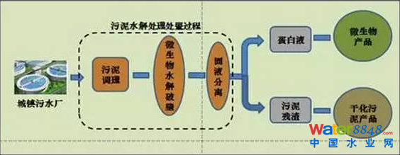 污泥微生物通過水解破壁處理后,其胞內(nèi)蛋白質(zhì)和水分得以釋放,再經(jīng)過固液分離后,可到含水率35-45%(減量70%以上)、有機物消減40-50%的污泥殘渣和可資源化利用的含蛋白液體。目前天津裕川環(huán)境在該方面已取得一定成績。