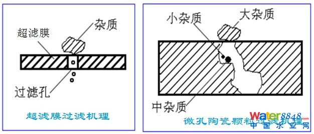 這是過濾截留原理示意圖,左圖表示超濾由固定孔徑機(jī)械截留,截留的雜質(zhì)在表面堆積,小于孔徑的雜質(zhì)會透過膜,液體的過濾路徑只有0.1微米。過濾精度越高則孔徑越小,但是推動力也越大,而節(jié)能微濾的過濾路徑是超濾路徑的數(shù)千倍,更多的截留雜質(zhì)不僅僅是在表面,而是在濾層和微孔之中,深長的過濾路徑彎彎曲曲,路徑的寬度忽大忽小,同時由于對顆粒表面的改性處理,不同的改性表面能夠?qū)Σ煌碾s質(zhì)具有吸附作用,從而使得較小的雜質(zhì)難以穿透濾層,初期截留的雜質(zhì)進(jìn)一步增加了濾料的表面積,從而可以截留更多更小的雜質(zhì),稱之為以渣濾渣。