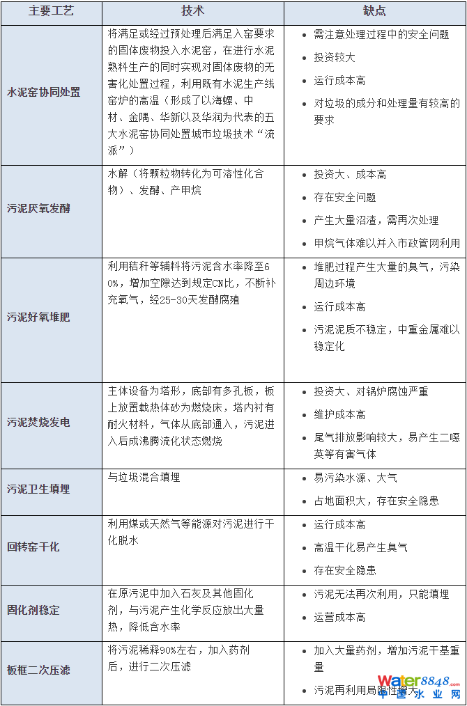 污水處理流程中將產(chǎn)生大量的污泥,污水處理程度越高,就會(huì)產(chǎn)生越多的污泥殘余物,需要加以處理。一般的污水處理廠必須設(shè)有污泥處理設(shè)施。對(duì)現(xiàn)代化的污水處理廠而言,污泥的處理與處置已成為污水處理系統(tǒng)運(yùn)行中最復(fù)雜、且花費(fèi)最高的一部分。以下表格梳理了污泥處理處置的7種主要工藝技術(shù)。