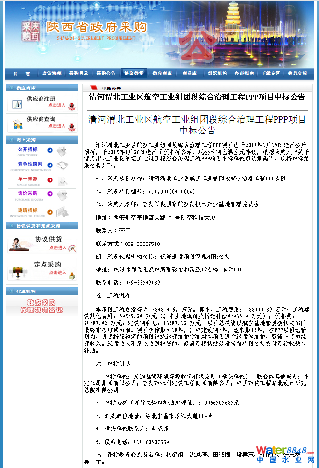 清河渭北工業(yè)區(qū)航空工業(yè)組團(tuán)段綜合治理PPP項目于2018年1月19日進(jìn)行了公開招標(biāo),經(jīng)評標(biāo)委員會評審,推薦以啟迪桑德環(huán)境資源股份有限公司牽頭,與中建三局集團(tuán)有限公司、西安市水利建設(shè)工程集團(tuán)有限公司、中國市政工程華北設(shè)計研究總院有限公司組成的聯(lián)合體中標(biāo)。