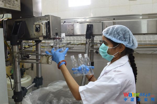 一名印度工人在天然礦泉水生產(chǎn)線上進(jìn)行操作。聯(lián)合國警告氣候變化和全球人口增長威脅數(shù)十億人的水資源安全。(法新社)