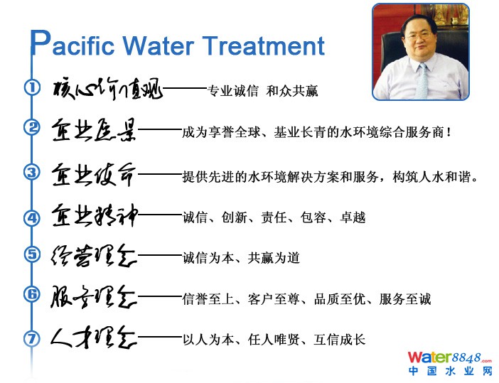 太平洋水處理將秉承“專業(yè)誠信 合眾共贏”的核心價值觀,通過不斷技術(shù)創(chuàng)新和完善產(chǎn)業(yè)鏈,長期專注于水處理綜合服務領(lǐng)域,為社會成就綠色夢想,打造碧水藍天做出積極貢獻。