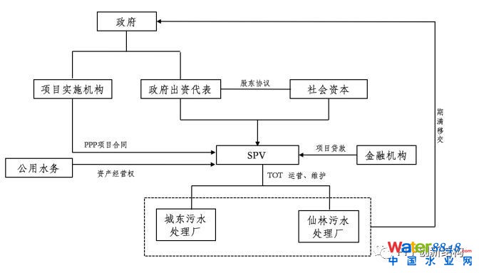 運(yùn)作模式說明:將已建設(shè)完成、正在運(yùn)行中的污水處理廠作為存量資產(chǎn)轉(zhuǎn)讓給項(xiàng)目公司,同時將該地公益性質(zhì)的濕地公園與可以產(chǎn)生現(xiàn)金流的中水回用廠進(jìn)行捆綁打包,這樣可以用污水處理廠的污水處理費(fèi)收入與中水回用廠的中水收益彌補(bǔ)公益性濕地公園的建設(shè)、運(yùn)營成本,減少政府的支出責(zé)任。