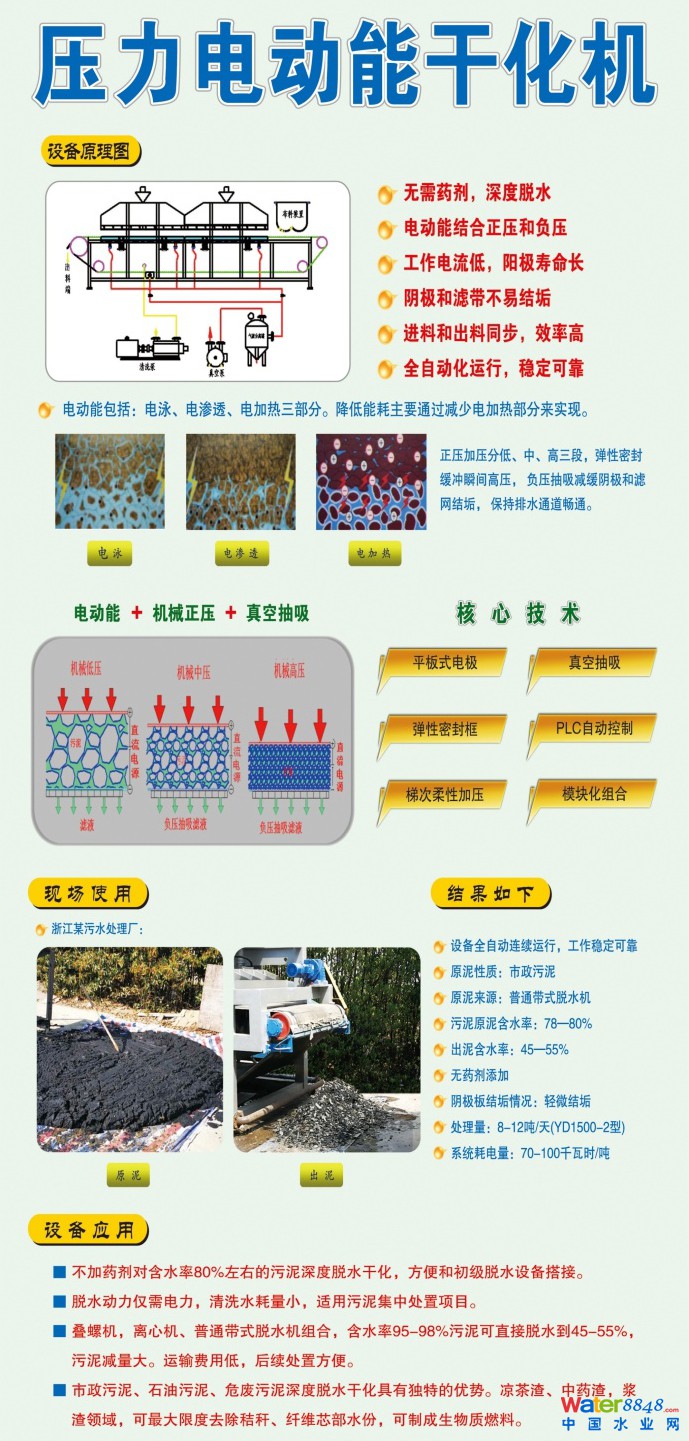 壓力電動能干化機,是歐可美公司為適應更廣泛的市場需求和環(huán)保新標的要求,結合多年來在無藥劑添加技術方面積累的豐富經(jīng)驗,悉心研發(fā)而成的最新產(chǎn)品,該產(chǎn)品適用于各種難處理污泥,脫水效果更好,性價比更高。