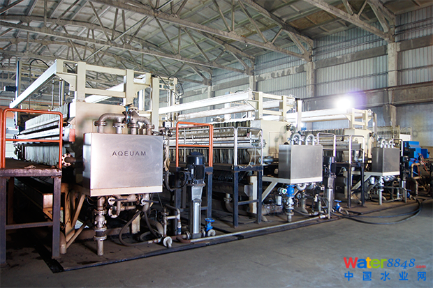 將一定含固率的泥漿(物料)先經(jīng)污泥極化裝置處理后,注入壓濾系統(tǒng)濾板行腔內,在該系統(tǒng)內完成過濾、濃縮和深度脫水,并形成含水率較低的污泥餅,自動落料排出,滲濾清夜返回循環(huán)系統(tǒng)再利用,全過程可自動控制。