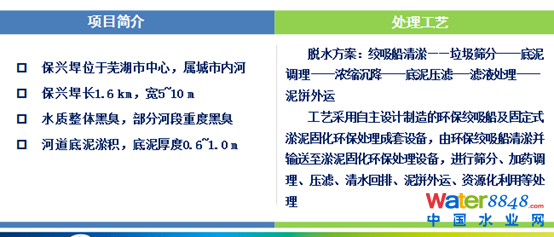一是蕪湖保興垾河道清淤整治工程。該項(xiàng)目中,如果將水抽干,對(duì)周邊的環(huán)境不利;大規(guī)模施工的話,周圍散步游玩的老百姓會(huì)有意見。針對(duì)上述情況,通源環(huán)境進(jìn)行了大量調(diào)研,最后決定與蕪湖城建集團(tuán)合作,由通源將底泥干化、資源化,制成營(yíng)養(yǎng)土以后,直接提供給城建集團(tuán),進(jìn)行園林綠化。