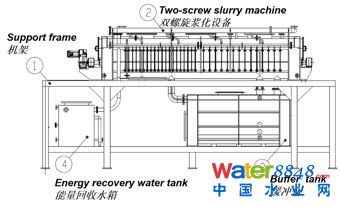 公司開發(fā)了預(yù)熱漿化成套設(shè)備專利設(shè)備,由機(jī)架、雙螺旋漿化設(shè)備、能量回收水箱和緩沖倉(cāng)四大部分組成,如下圖: