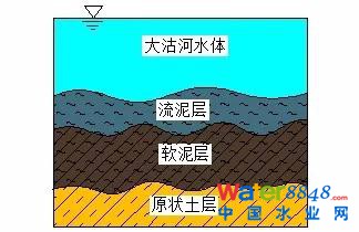 A河道及兩條支流全長(zhǎng)81.6km,自1965年改造至今,40余年來(lái)一直是某城市南部區(qū)域主要工業(yè)廢水、生活污水及污水處理廠尾水的排放通道。目前,該河道斷面逐年減小,河底淤泥深達(dá)1-2m,沿河構(gòu)筑物損壞嚴(yán)重且規(guī)模不足。對(duì)該河道水流及底泥進(jìn)行調(diào)查,水質(zhì)氨氮達(dá)125mg/Kg,生化需氧量246mg/Kg,流泥層含水率50%-100%,軟泥層含水率38%-50%,原狀土層含水率33%,污染嚴(yán)重。