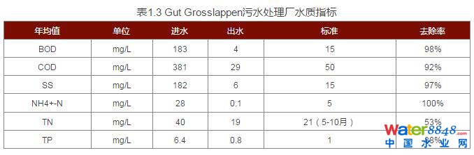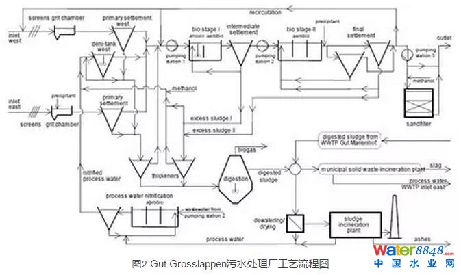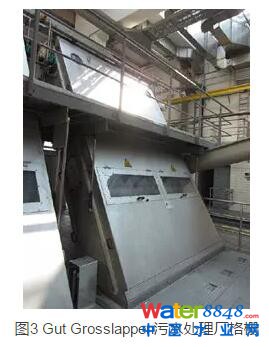 Gut Grosslappen污水廠的污泥處理包含了Gut Marienhof污水廠的污泥,泥量各占50%。沼氣發(fā)電量可以提供全廠50%的用電量。處理工藝為:濃縮→厭氧消化→焚燒(蒸汽干化到含固率45%,然后800℃焚燒),沼氣經(jīng)過提純后用于熱電聯(lián)產(chǎn)。