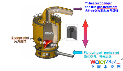 Pyrofluid®焚燒爐自下而上由風室、拱頂、砂床、燃燒室、爐頂和煙道組成。風室相當于加壓室,經(jīng)過預熱的流化空氣注入到風室里并均勻分布在整個流化床表面。在于流化空氣相對應的另一側有一個啟動燃燒器,在安裝調(diào)試期間或再啟動是對流化空氣進行預熱。由耐火磚建造而成的拱頂將風室和流化床隔開。拱頂上布滿有規(guī)則的開孔,安裝噴頭。噴頭是由耐火鋼鑄成,噴頭外壁布滿小孔,這樣可以保證燃燒氣體均勻分布而砂子不會落入風室。拱頂?shù)纳厦媸巧按,在此位置圍繞焚燒爐一圈均勻分布了污泥注入口,同時還有輔助燃料注入口。燃燒室內(nèi)煙氣溫度為850°C,在運行期間一旦溫度未達到設定值,就需要啟動輔助燃料。煙氣包括燃燒氣體、水蒸氣和礦渣等通過爐頂去往熱交換器和廢氣處理系統(tǒng)。爐頂上設有服務水噴淋系統(tǒng),如果煙氣溫度過高,通過噴灑服務水進行調(diào)節(jié)。威立雅Pyrofluid®焚燒爐總體來說具有低維護性、操控性強、可長期運行、無可移動部件等特點。截止至目前我們在全球已經(jīng)有50+的業(yè)績。