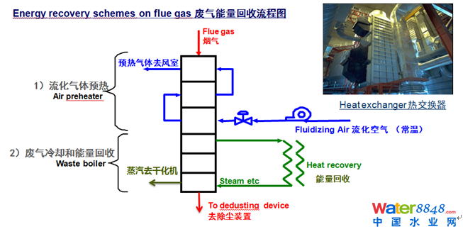 從焚燒爐出來的煙氣和灰分進入熱交換器,熱交換器的功能主要是1)流化氣體的預熱2)廢氣冷卻和能量回收。高溫煙氣從頂部進入第一級熱交換器,預熱流化氣體,然后再進入第二級熱交換器,能量回收的過程可以產(chǎn)生蒸汽用于前端的污泥干化。經(jīng)過兩級熱交換器以后的廢氣冷卻至200°C左右,進入后續(xù)煙氣處理系統(tǒng)。