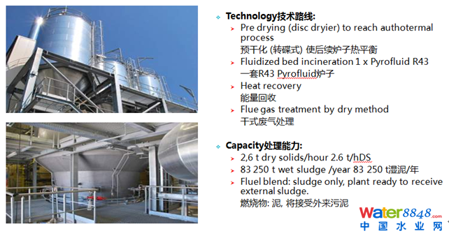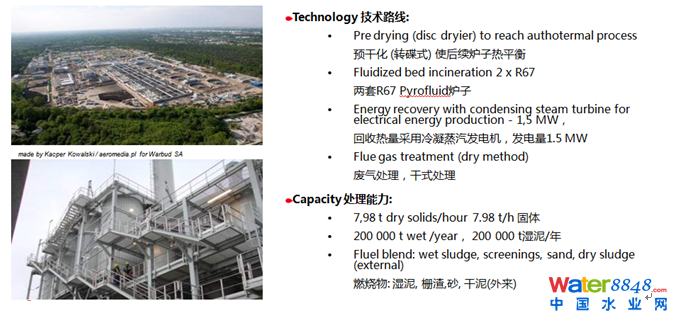 第三部分給大家展示幾個典型案例。第一個案例是波蘭Warsaw (華沙) 污泥焚燒廠,采用的就是半干化+焚燒的方案。他的技術路線和處理能力如下: