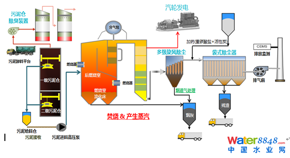 污泥焚燒的主工藝主要包括污泥的接受系統(tǒng),分別接受初沉污泥和二沉污泥,然后將兩種污泥定量混合后通過污泥進料柱塞泵輸送至焚燒爐內(nèi)。產(chǎn)生的高溫煙氣經(jīng)過三級熱交換器產(chǎn)生40kg的過熱蒸汽,去推動汽輪機發(fā)電。煙氣處理采用是干式處理,收集的灰分和殘渣分別儲存再運輸?shù)綀鐾馓幹,最后達到歐盟和香港排放標準的潔凈煙氣通過引風機排放至大氣。