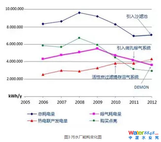 該污水廠所屬的水委會一直致力于改善能耗的研究,自2008年前污水廠的耗能持續(xù)減少,而由于沼氣產(chǎn)量提高熱電聯(lián)產(chǎn)的產(chǎn)電量也不斷增加。