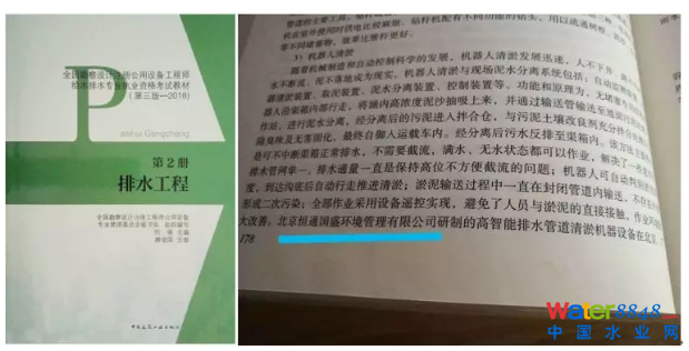 北京恒通國(guó)盛環(huán)境管理有限公司(簡(jiǎn)稱:恒通環(huán)境)的清淤機(jī)器人新工藝,近日入選了全國(guó)勘察設(shè)計(jì)注冊(cè)公用設(shè)備工程師給水排水專業(yè)執(zhí)業(yè)資格考試的最新教材《排水工程》(第三版-2018)。這是恒通環(huán)境清淤機(jī)器人新工藝首次入選全國(guó)注冊(cè)公用設(shè)備工程師考試教材。機(jī)器人清淤技術(shù)日益成熟、穩(wěn)定,也標(biāo)志著我國(guó)的市政管網(wǎng)清淤工藝取得了新的突破!