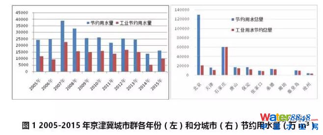 京津冀城市群水資源十分缺乏,但在用水效率提高的前提下,可以通過調(diào)整產(chǎn)業(yè)規(guī)劃與用水定額來實現(xiàn)用水總量的零增長。2005-2015年期間,2007年節(jié)約用水量達到高峰,之后逐年下降(見圖1左)。