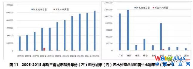 珠三角城市群2005-2015年期間,污水處理總量持續(xù)增加,但再生水利用量并沒有與之同比例增加,再生水利用總量占污水處理總量的占比僅為1.6%(見圖11左)。這可能是由于該地區(qū)雨水豐沛,污水處理后的水作為生態(tài)用水更為經(jīng)濟[1]。2008年珠三角城市群再生水利用量達到峰值,且主要來自東莞市和肇慶市(見圖11右)。