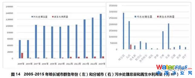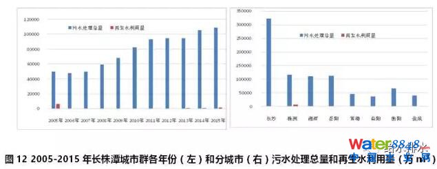 長株潭城市群2005-2015年期間,污水處理總量持續(xù)增加,2015年污水處理總量達到10億m³,是2005年的2.2倍。2002-2008年期間廢水排放總量基本與經(jīng)濟增長水平保持同步遞增趨勢,且廢水排放生產(chǎn)率快速提高,總體環(huán)境污染負荷較高。盡管長株潭城市群2005年至2010年期間工業(yè)廢水排放達標率持續(xù)改善,但區(qū)域上中下游城市污水集中處理率分別為15.3%、31.8%、49.4%,水污染問題嚴重。2009年是長株潭城市群污水處理量提升的一個關(guān)鍵年份,2009年以后污水處理量大幅度提升,這可以有效改善區(qū)域生態(tài)環(huán)境資源承載能力。但再生水利用量沒有同比例增加,其用量僅為污水處理總量的1.2%(見圖12左)。除長沙和株洲外,湘潭、岳陽、常德、益陽、衡陽和婁底這六個城市均無再生水生產(chǎn)和利用行為(見圖12右)。研究表明,長株潭城市群2030年城市化率達到90%、第二產(chǎn)業(yè)和第三產(chǎn)業(yè)持續(xù)增長的態(tài)勢下,只有將污水處理率提高到100%、污水回用率提高到35%的條件下,才不會產(chǎn)生水資源供需缺口狀況[7]。提升城市群再生水利用率是實現(xiàn)水資源供需平衡的一個重要措施。
