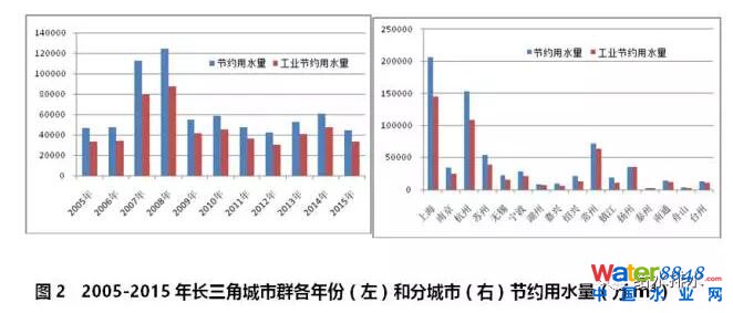 長三角城市群2005-2015年期間,2007年和2008年節(jié)約用水達到高峰后,節(jié)約用水量呈明顯下滑趨勢。工業(yè)用水節(jié)約總量占節(jié)約用水總量的73.8%(見圖2左)。整個城市群節(jié)約用水數(shù)據(jù)統(tǒng)計工作非常好,僅泰州市缺失2012年到2015年的節(jié)約用水數(shù)據(jù)。節(jié)約用水量前三位的城市分別是上海、杭州和常州,占到城市群節(jié)水總量的62%(見圖2右)。