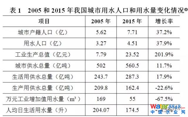 2005~2015年期間,城市戶籍人口、用水人口數(shù)量和工業(yè)生產(chǎn)總值大幅度提高,城市供水總量僅增長了11.7%。同期,萬元工業(yè)增加值用水量下降了67.5%,人均日生活用水量降低了14.5%,生產(chǎn)用供水總量下降了22.6%,生活用供水總量僅增長了17.9%(見表1)。