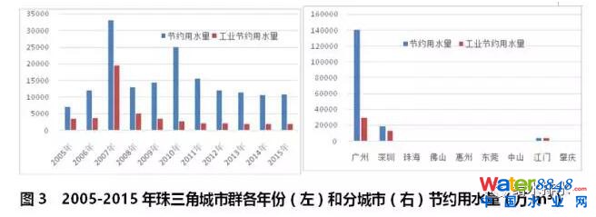 珠三角城市群2005-2015年期間,只有廣州市有完整的節(jié)約用水數(shù)據(jù),深圳、東莞、江門和肇慶2010年前有個別年份的節(jié)約用水數(shù)據(jù),珠海、佛山、惠州和中山則完全沒有進行統(tǒng)計。2008年整個城市群節(jié)約用水量達到高峰,之后逐年下滑(見圖3左)。工業(yè)節(jié)約用水比重占全部節(jié)約用水總量的29.2%,廣州市為21.4%(見圖3右)。