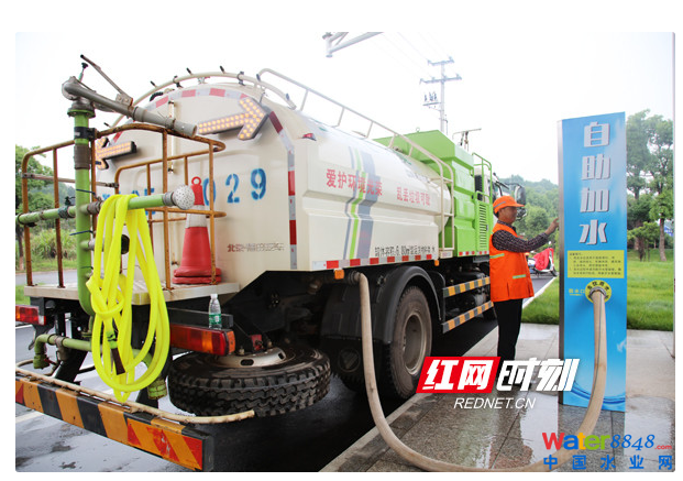 環(huán)衛(wèi)灑水車正在自助加水。