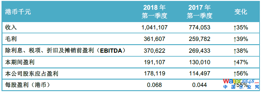 回顧期內(nèi),公司錄得收入港幣10.41 億元,較2017 年第一季度上升35%,收入上升主要得益于建造收入、運(yùn)營服務(wù)收入及財(cái)務(wù)收入的增加;其中,建造收入增長主要源于回顧期內(nèi)若干水環(huán)境綜合治理項(xiàng)目的建設(shè)、供水項(xiàng)目的建設(shè)以及若干在建的污水處理項(xiàng)目擴(kuò)建及提標(biāo)改造。毛利較去年同期增長39%至港幣3.62 億元,毛利率35%;EBITDA 較2017 年同期增長38%至港幣3.71 億元;本期間盈利較2017 年同期增長47%至港幣1.91 億元;本公司股東應(yīng)占盈利較2017 年同期增長56%至港幣1.78 億元。截至2018 年3 月31 日,資產(chǎn)負(fù)債率約51.0%,負(fù)債水平維持合理水平,財(cái)務(wù)狀況健康良好。